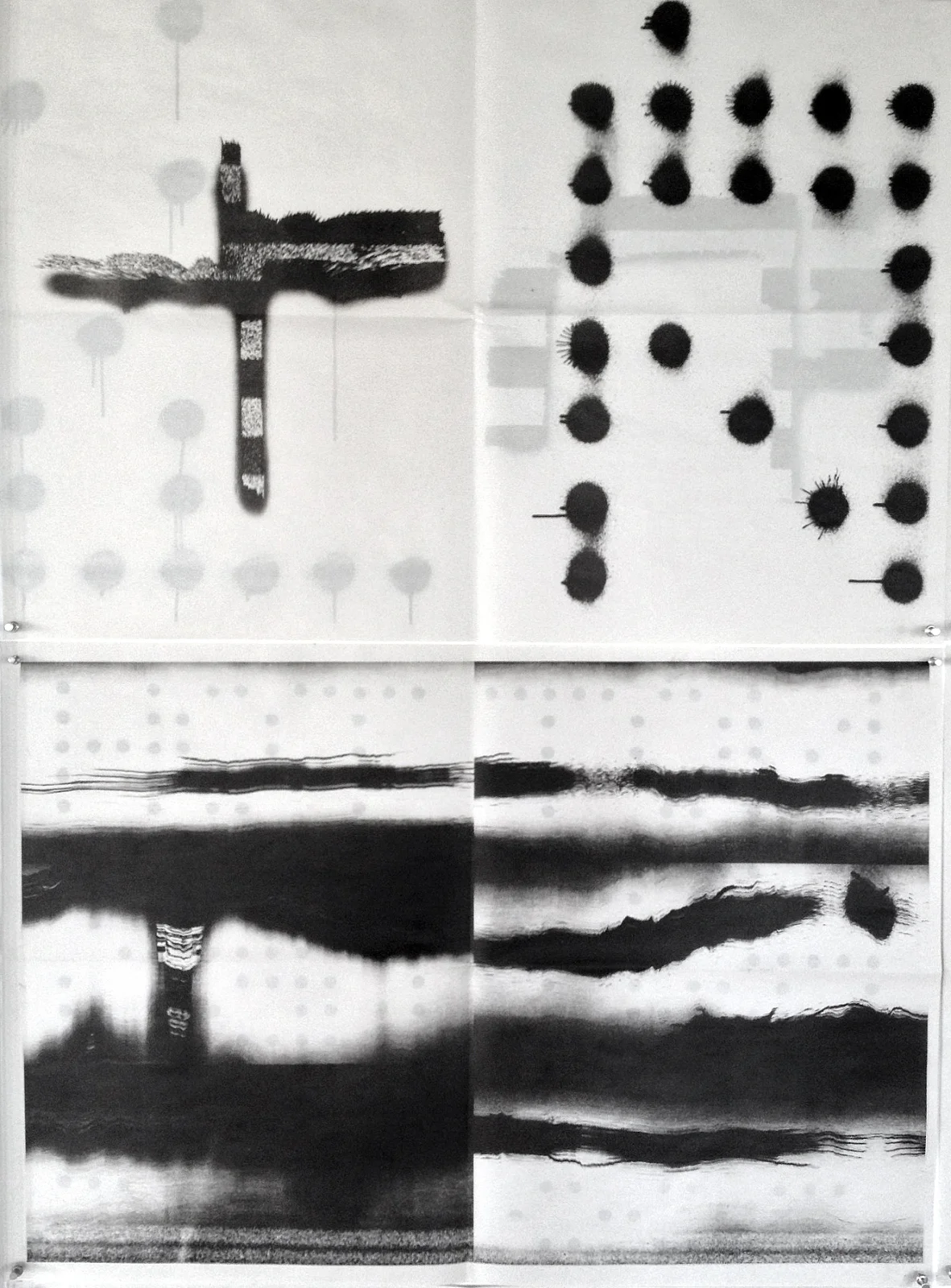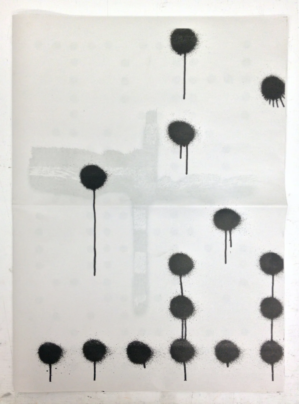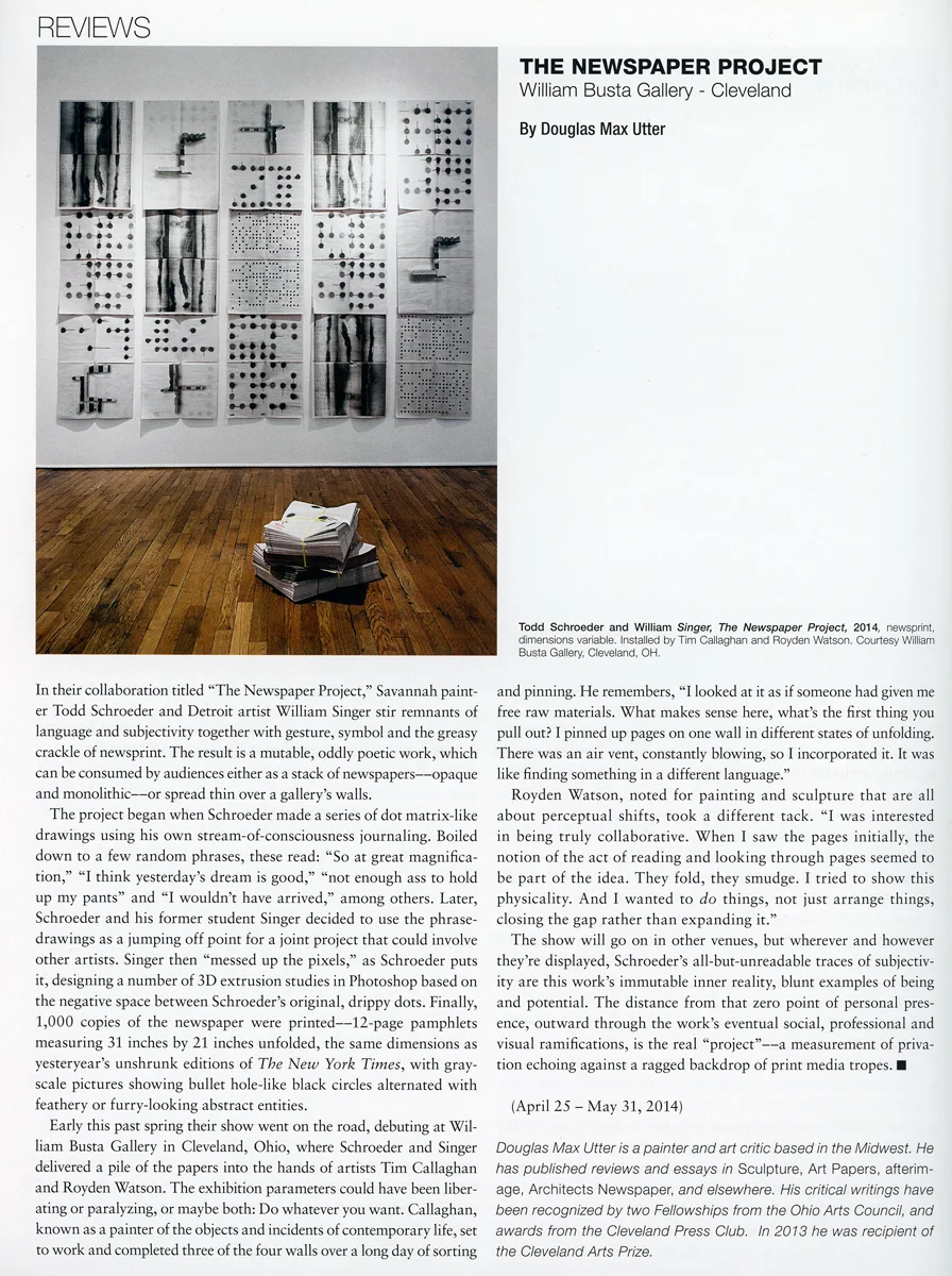 Todd Schroeder: With a conscious desire to enter a process that flipped back and forth from the subjective to the objective, this work was initiated in the summer of 2011 as writing. A visceral response to a paradoxical situation that coupled the anxiety of an impending extended separation from my family with the immersion into a beautiful remote location halfway around the world. The resulting unedited stream of consciousness writing was then cut up and reassembled in a complex systematic way. The results were reassessed and reinterpreted as a series of phrases. These phrases were then arranged in small-scale drawings via a grid to a matrix of dots resembling dot matrix signage. Those signs were scaled up and transferred to individual translucent sheets of drafting film (24x19inches each), the dots being made by using an atomizer to blow an ink and flashe mixture onto the surface of the film. Initially the sheets were assembled as a sign so that the phrase could be read clearly (large scale wall installations). Though through subsequent assemblies, dis-assemblies, and reassemblies the phrases have been “lost”. Within this fortuitous process a resulting foregrounding of the primacy of the marks and interrelationships of elements has evolved. This Newspaper project, and the construct of the newspaper in general supplies a context that reforms the evolution of this work. The primacy of the text is reasserted to an extent, extrapolating on the aesthetic qualities of text without backpedaling to an earlier stage in the development.